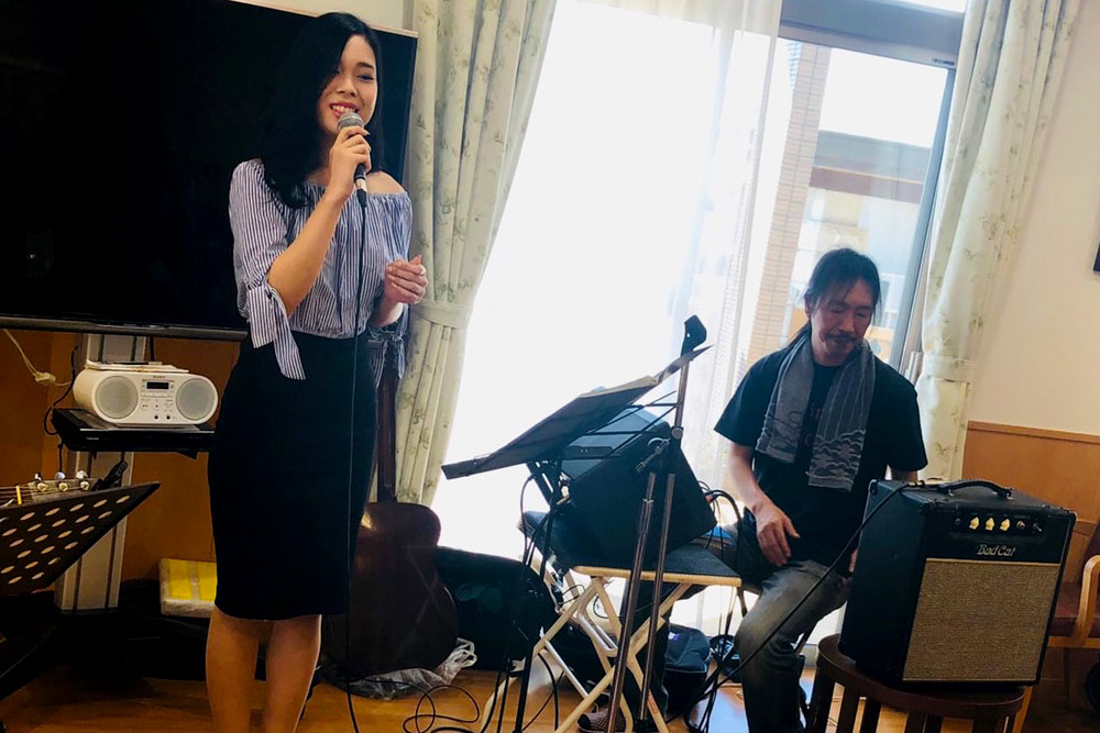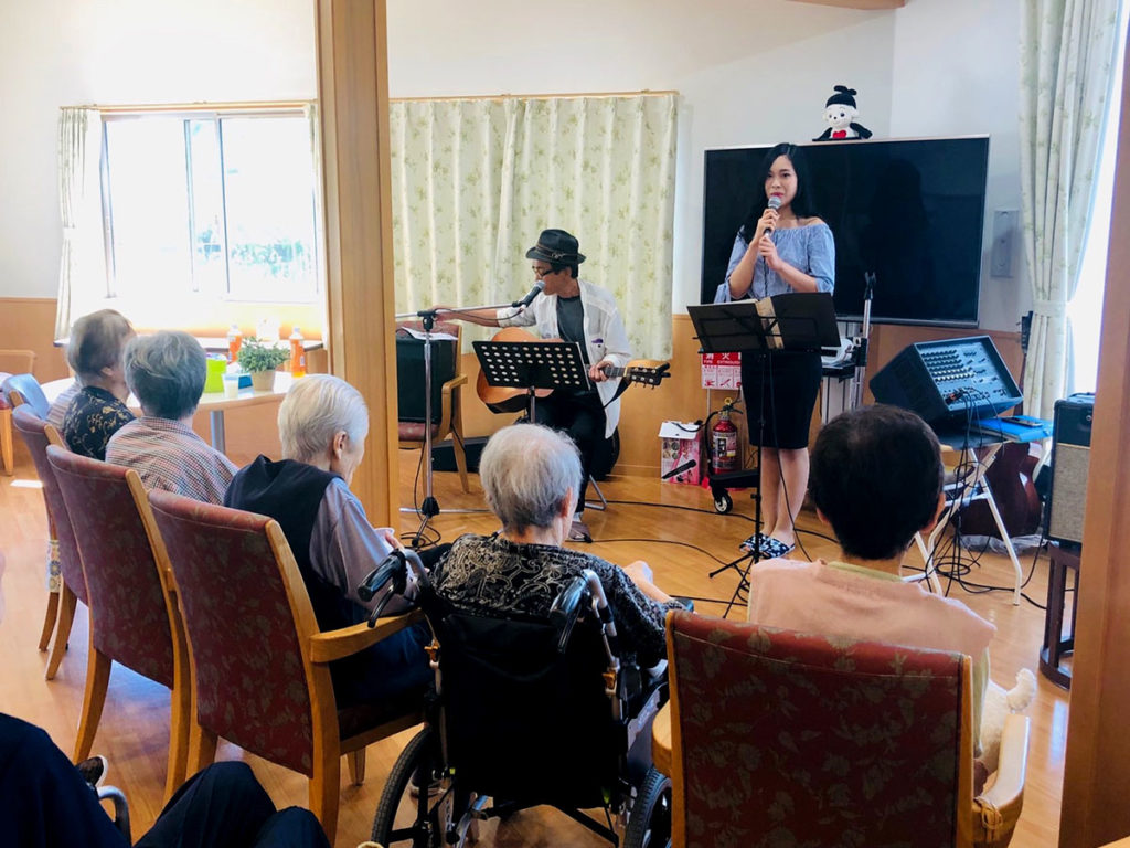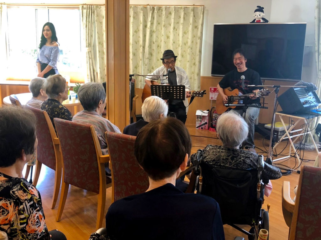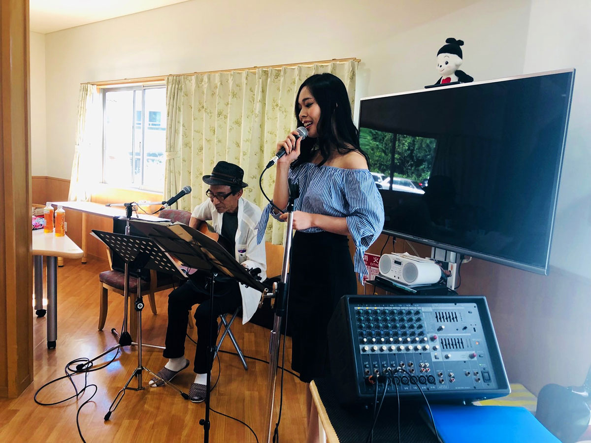 ボビーさんが奏でる心地よい音色に寄り添うように、はるかさんの歌声が優しく、時に情感豊かに響き渡ります。その歌と音楽に、昔を思い出して懐かしさに浸る入居者様はもちろん、私たちスタッフまでもがすっかり魅了されました。