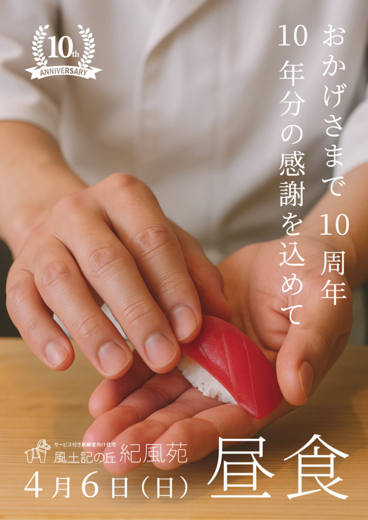 紀風苑開設10周年企画 第2弾はわかやま健美食LABOさん全面協力のもと、この日の昼食は握り寿司イベントを開催しました。